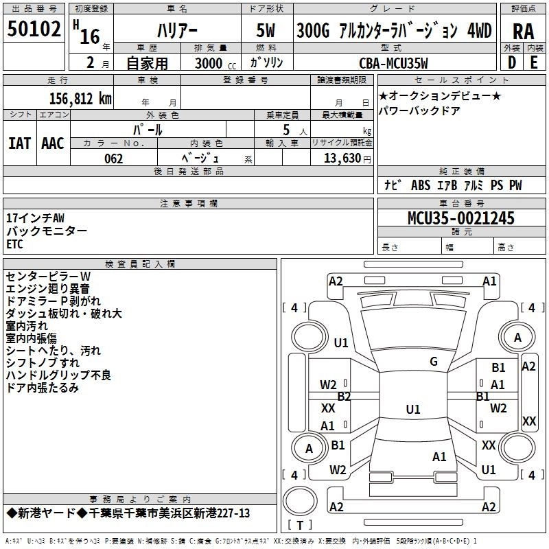 | 300G ALCANTARA VERSION | CBA-MCU35W | 1MZ-FE | Full-time 4WD | 5AT | 2994cc | 220ps(162kW)/5800rpm | AИ-95 | 3 822 000 | |