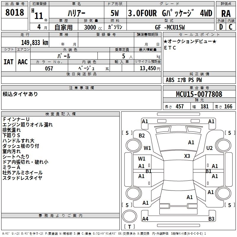 | 3.0 FOUR EXTRA G PACKAGE | GF-MCU15W | 1MZ-FE | Full-time 4WD | 4AT | 2994cc | 220ps(162kW)/5800rpm | AИ-95 | 3 140 000 | |