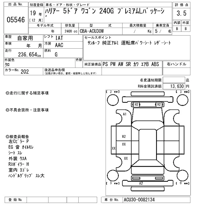 | 240G PREMIUM L PACKAGE | CBA-ACU35W | 2AZ-FE | Full-time 4WD | 4AT | 2362cc | 160ps(118kW)/5600rpm | AИ-92 | 3 255 000 | |