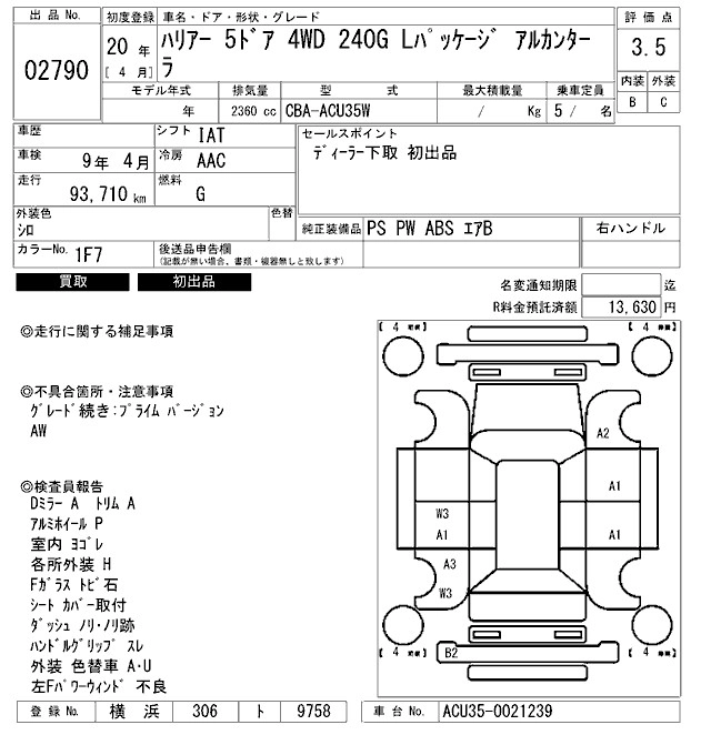 | 240G L PACKAGE ALCANTARA PRIME VERSION | CBA-ACU35W | 2AZ-FE | Full-time 4WD | 4AT | 2362cc | 160ps(118kW)/5600rpm | AИ-92 | 3 570 000 | |