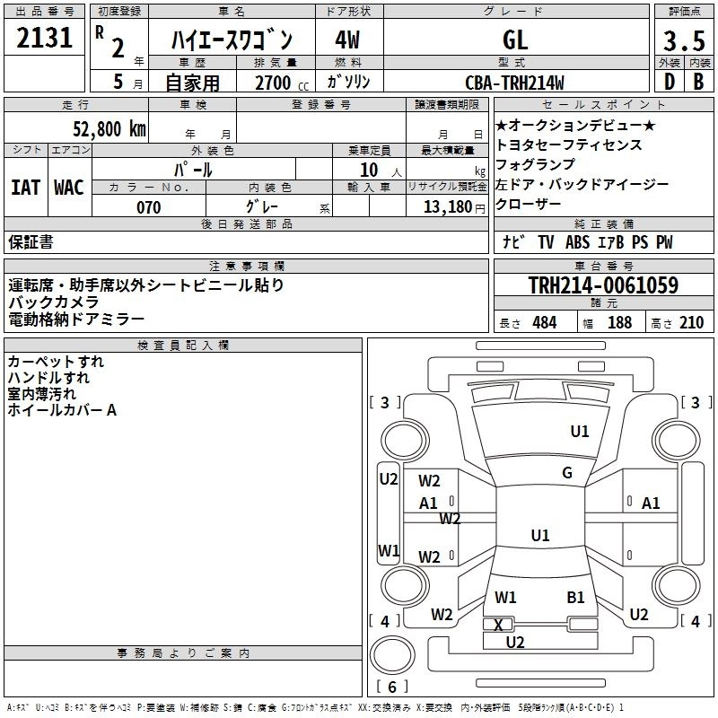 | GRAND CABIN | 3BA-TRH224W | 2TR-FE | FR | 6AT | 2693cc | 160ps(118kW)/5200rpm | AИ-92 | 3 684 000 | |