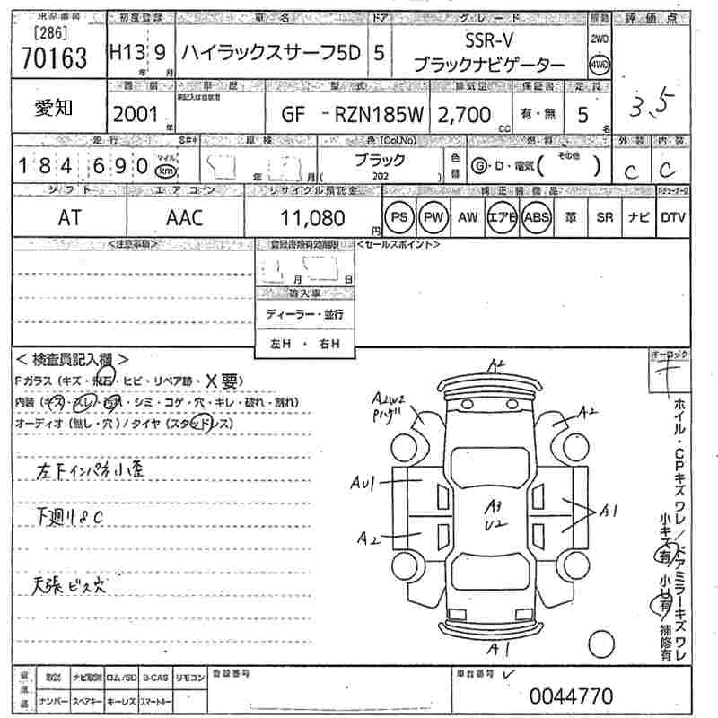 | SSR-V BLACK NAVIGATOR | GH-RZN185W | 3RZ-FE | Part-time 4WD | 4AT | 2693cc | 150ps(110kW)/4800rpm | AИ-92 | 2 740 000 | |