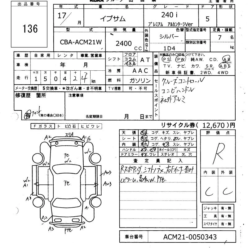| 240I | DBA-ACM21W | 2AZ-FE | FF | 4AT | 2362cc | 160ps(118kW)/5700rpm | AИ-92 | 2 257 500 |