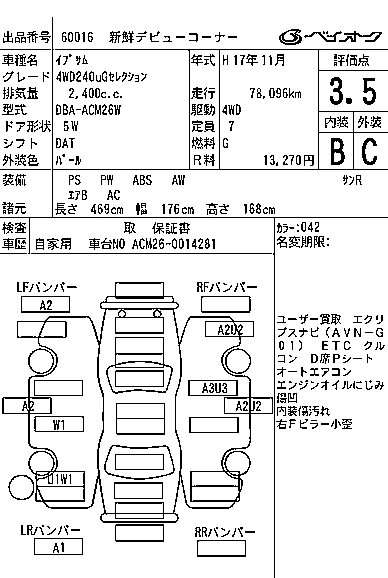 | 240U G SELECTION | DBA-ACM26W | 2AZ-FE | Full-time 4WD | 4AT | 2362cc | 160ps(118kW)/5700rpm | AИ-92 | 3 024 000 | |