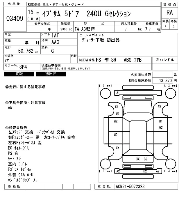 | 240U | UA-ACM26W | 2AZ-FE | Full-time 4WD | 4AT | 2362cc | 160ps(118kW)/5700rpm | AИ-92 | 2 730 000 | |