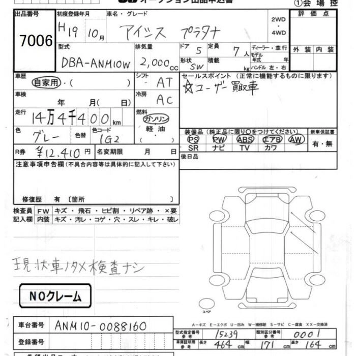 | PLATANA U SELECTION | DBA-ANM15W | 1AZ-FSE(D-4) | Full-time 4WD | CVT | 1998cc | 155ps(114kW)/6000rpm | AИ-92 | 2 604 000 | |