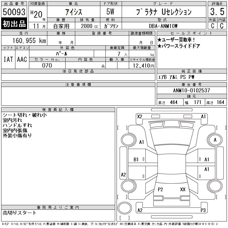 | PLATANA LIMITED | DBA-ANM10W | 1AZ-FSE(D-4) | FF | CVT | 1998cc | 155ps(114kW)/6000rpm | AИ-92 | 2 331 000 | |