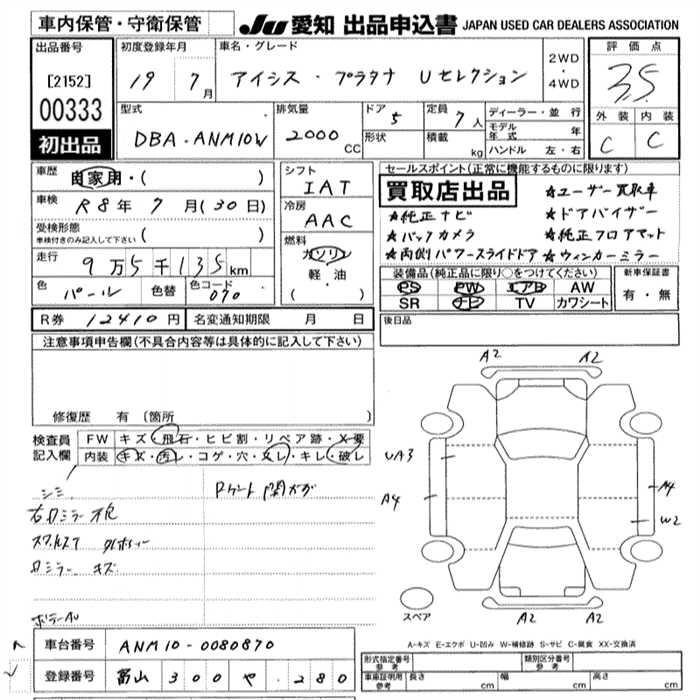 | PLATANA U SELECTION | DBA-ANM10W | 1AZ-FSE(D-4) | FF | CVT | 1998cc | 155ps(114kW)/6000rpm | AИ-92 | 2 394 000 | |