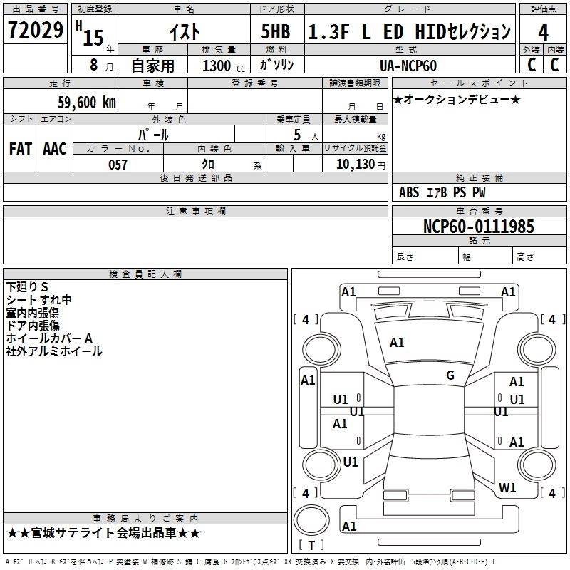 | 1.5 F L EDITION HID SELECTION NAVI SPECIAL | UA-NCP65 | 1NZ-FE | Full-time 4WD | 4AT | 1496cc | 105ps(77kW)/6000rpm | AИ-92 | 1 600 000 | |