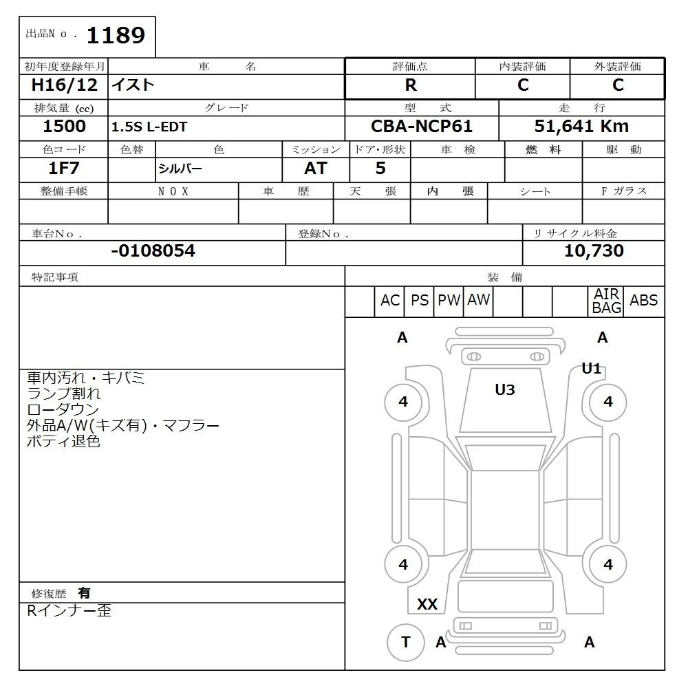 | 1.5 F L EDITION HID SELECTION | CBA-NCP65 | 1NZ-FE | Full-time 4WD | 4AT | 1496cc | 105ps(77kW)/6000rpm | AИ-92 | 1 530 000 | |
