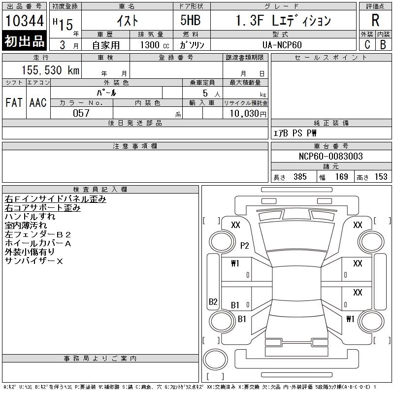| 1.3 F E EDITION | UA-NCP60 | 2NZ-FE | FF | 4AT | 1298cc | 87ps(64kW)/6000rpm | AИ-92 | 1 180 000 |