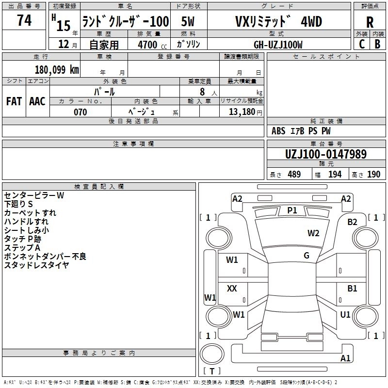 | VX | GH-UZJ100W | 2UZ-FE | Full-time 4WD | 5AT | 4663cc | 235ps(173kW)/4800rpm | AИ-95 | 3 800 000 |
