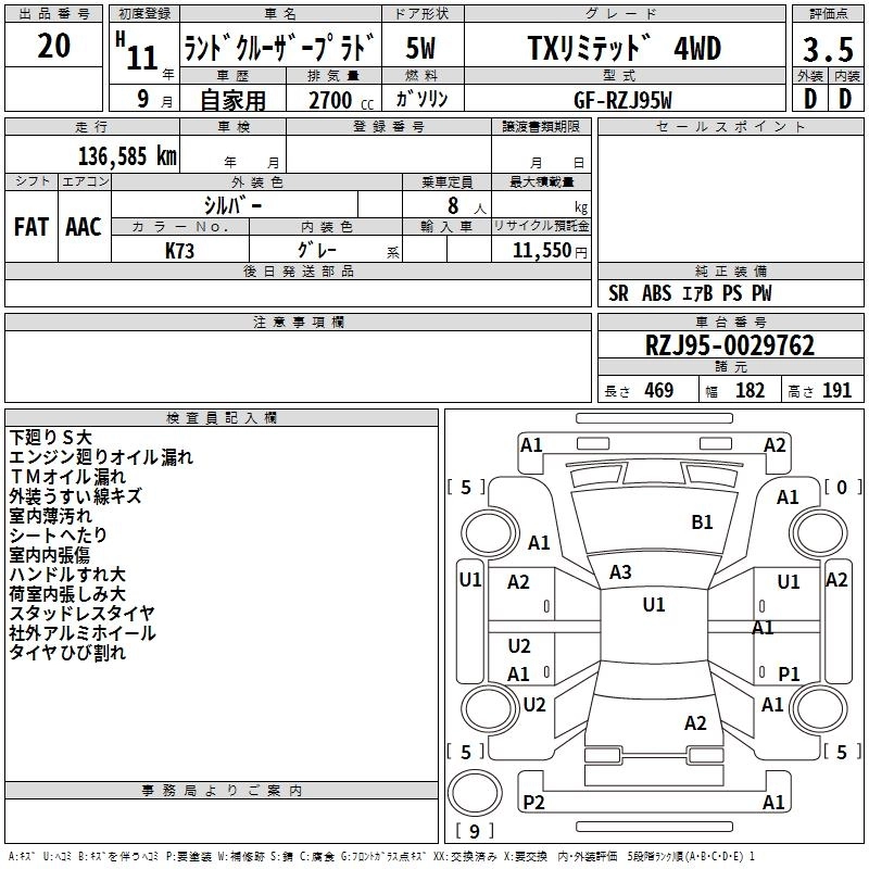| TX LIMITED | GF-RZJ95W | 3RZ-FE | Full-time 4WD | 4AT | 2693cc | 150ps(110kW)/4800rpm | AИ-92 | 2 900 000 | |