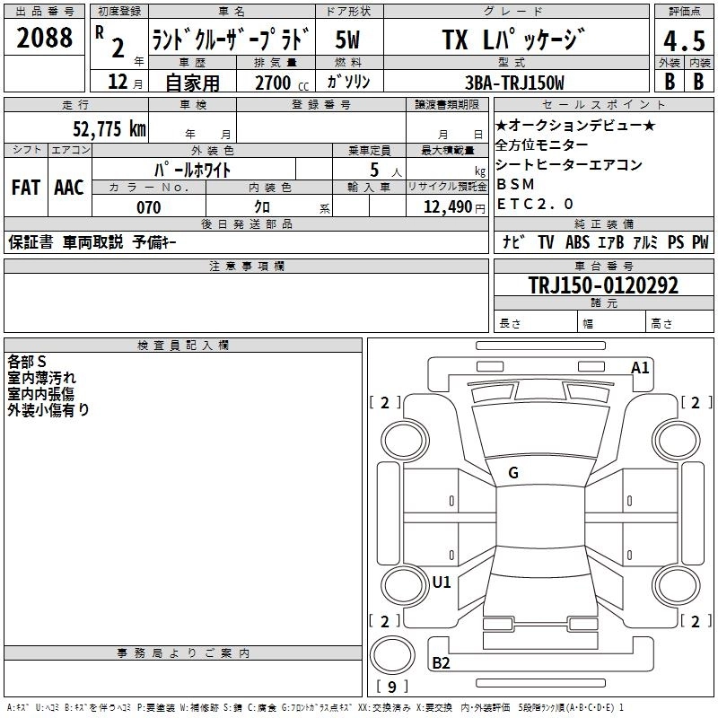 TX L PACKAGE 3BA-TRJ150W 2TR-FE Full-time 4WD 6AT 2693cc 163ps(120kW)/5200rpm AИ-92 4 140 000