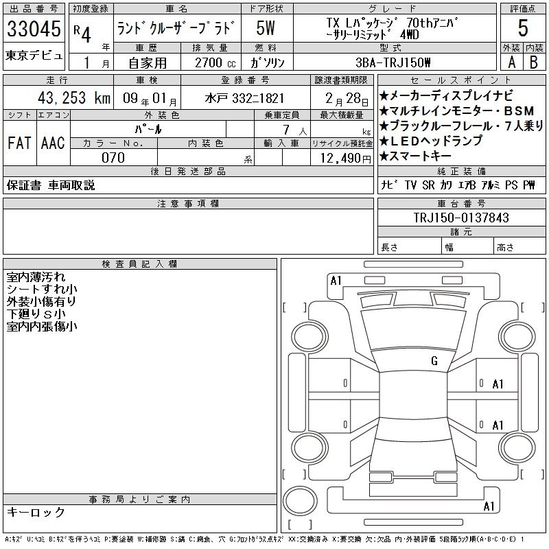 43 000 км КузовTRJ150W КомплектацияTX L PACK 70TH ANNIVER 4WD