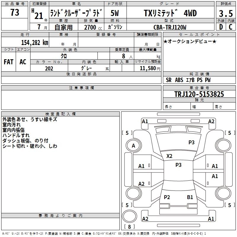 | TX | CBA-TRJ150W | 2TR-FE | Full-time 4WD | 4AT | 2693cc | 163ps(120kW)/5200rpm | AИ-92 | 3 150 000 |