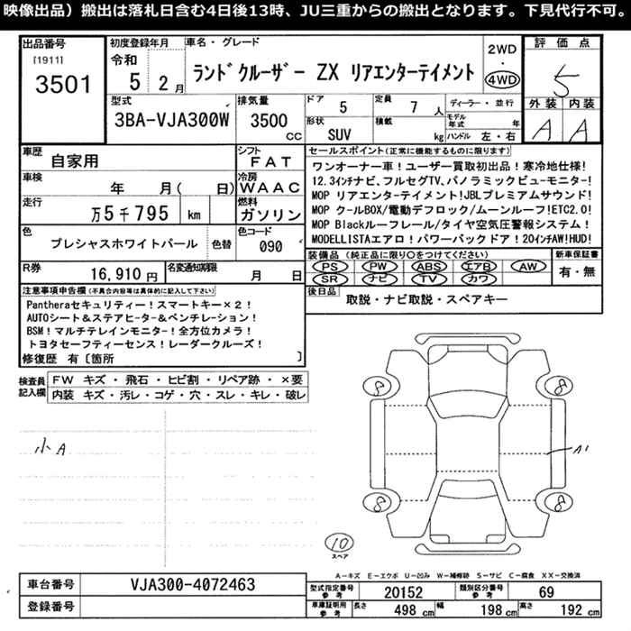 Год выпуска2023 Пробег 6 000 км КузовVJA300W КомплектацияZX REAR ENTERTAINMENT