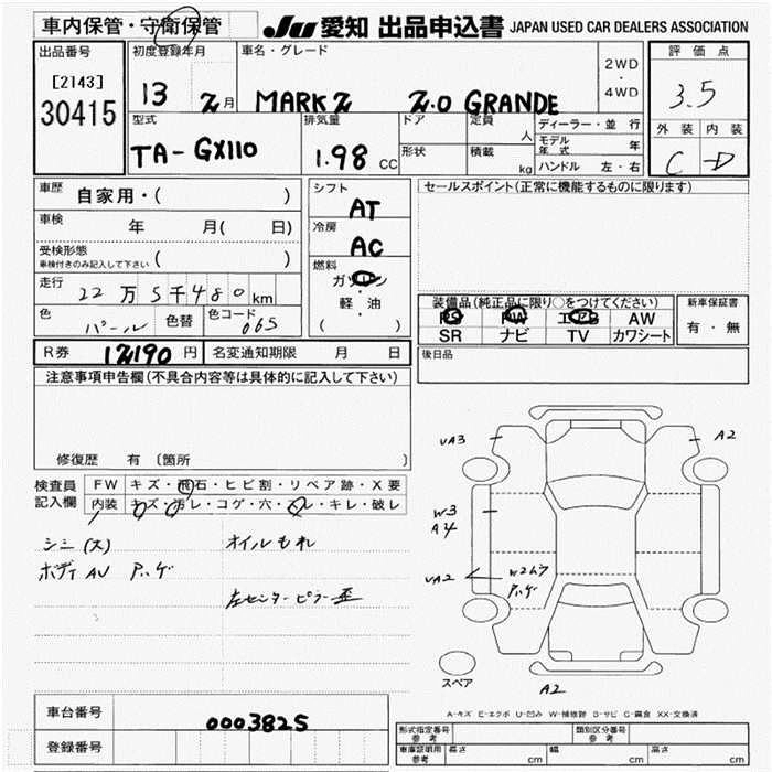 2.0GRANDE FOUR REGALIA NAVI PACKAGE TA-GX115 1G-FE Full-time 4WD 4AT 1988cc 160ps(118kW)/6200rpm AИ-92 3 010 000