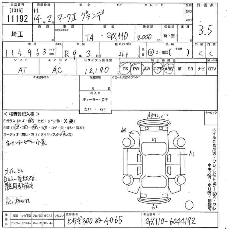 | 2.0GRANDE FOUR REGALIA NAVI PACKAGE | TA-GX115 | 1G-FE | Full-time 4WD | 4AT | 1988cc | 160ps(118kW)/6200rpm | AИ-92 | 3 050 000 | |
