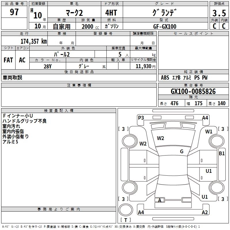 | GRANDE G | GF-JZX101 | 2JZ-GE | FR | 4AT | 2997cc | 220ps(162kW)/5600rpm | AИ-95 | 3 470 000 | |