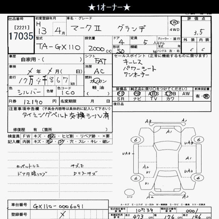 | GRANDE REGALIA | TA-JZX110 | 1JZ-FSE | FR | 4AT | 2491cc | 200ps(147kW)/6000rpm | AИ-95 | 2 840 000 | |