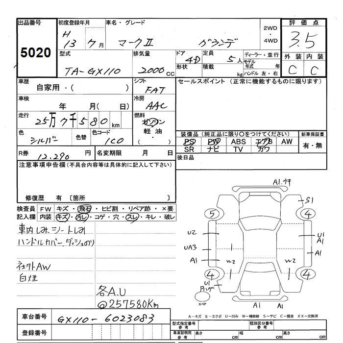 | GRANDE REGALIA | TA-JZX110 | 1JZ-FSE | FR | 4AT | 2491cc | 200ps(147kW)/6000rpm | AИ-95 | 2 840 000 | |