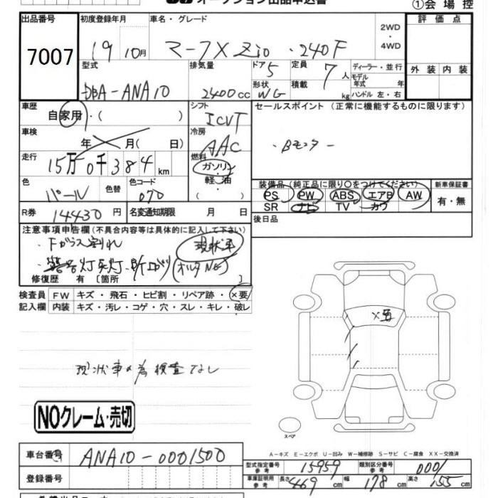 | 240F AEROTOURER S | DBA-ANA10 | 2AZ-FE | FF | CVT | 2362cc | 163ps(120kW)/6000rpm | AИ-92 | 3 125 000 | |