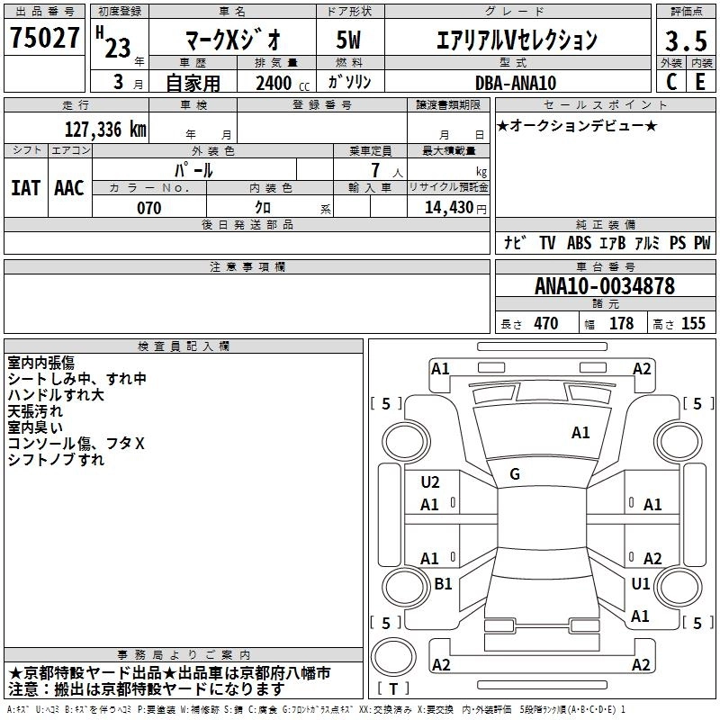 TOYOTA MARK X ZIO 2011 г., лот № 75027