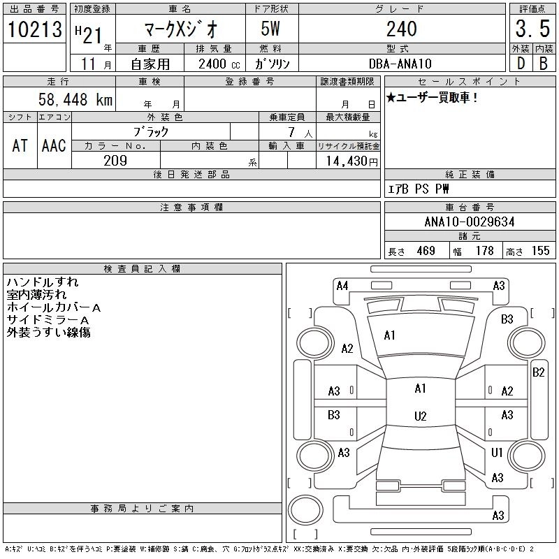 | AERIAL | DBA-ANA10 | 2AZ-FE | FF | CVT | 2362cc | 163ps(120kW)/6000rpm | AИ-92 | 2 780 000 | |