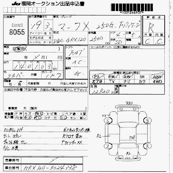 | 250G FOUR LIMITED | DBA-GRX125 | 4GR-FSE | Full-time 4WD | 5AT | 2499cc | 215ps(158kW)/6400rpm | AИ-95 | 3 097 500 | |