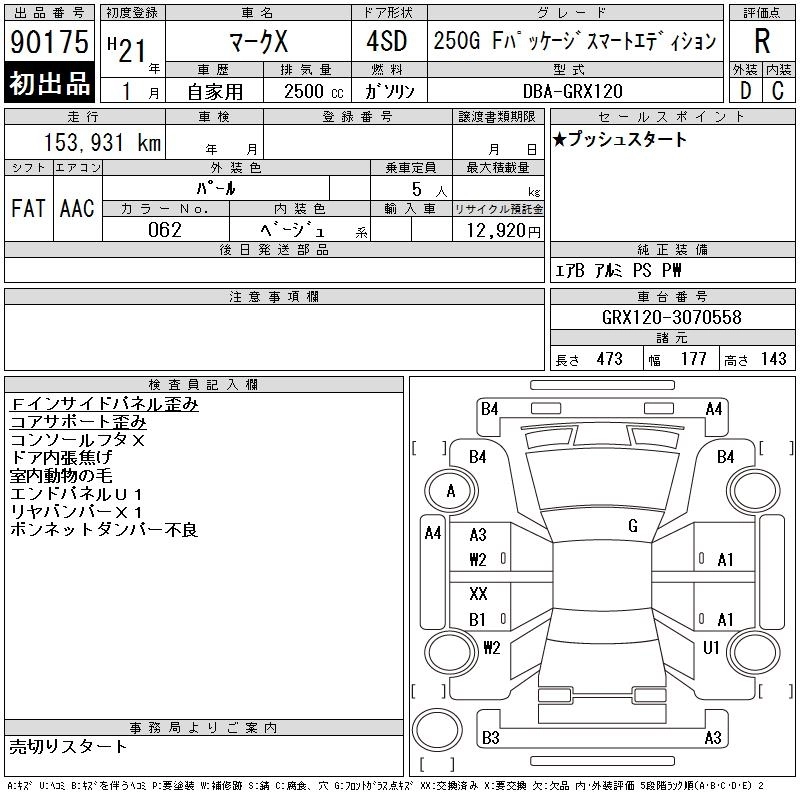 | VERTIGA 250G S PACKAGE RELAX SELECTION | DBA-GRX130 | 4GR-FSE | FR | 6AT | 2499cc | 203ps(149kW)/6400rpm | AИ-92 | 3 262 000 | |