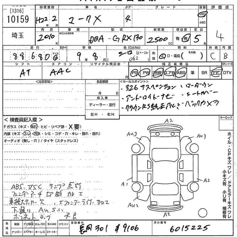 | 250G FOUR BLACK LIMITED | DBA-GRX135 | 4GR-FSE | Full-time 4WD | 6AT | 2499cc | 203ps(149kW)/6400rpm | AИ-92 | 2 981 000 | |