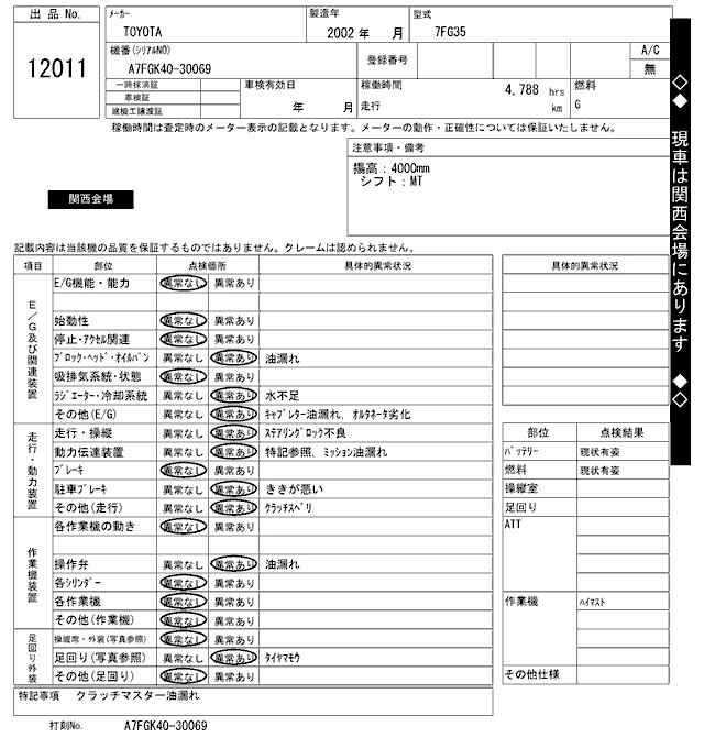 Год выпуска2002 Пробег 5 000 км Кузов7FG35 Комплектация FORKLIFT