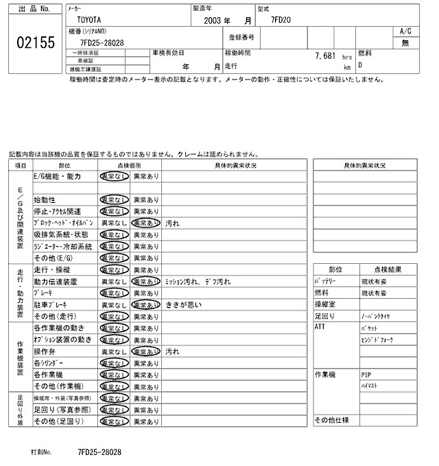 Год выпуска2003 Пробег 8 000 км Кузов7FD20 Комплектация FORKLIFT