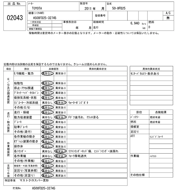 Год выпуска2011 Пробег 7 000 км Кузов50-8FD25 Комплектация FORKLIFT