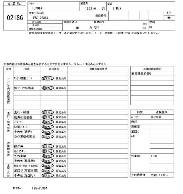 Год выпуска1992 Кузов2FBL7 Комплектация BATTERY SI YELLOW FORKLIFT
