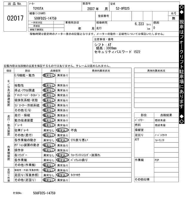 Год выпуска2007 Пробег 6 000 км Кузов52-8FD25 Комплектация FORKLIFT