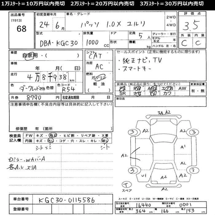 | X | DBA-KGC30 | 1KR-FE | FF | CVT | 996cc | 69ps(51kW)/6000rpm | AИ-92 | 1 105 000 | |