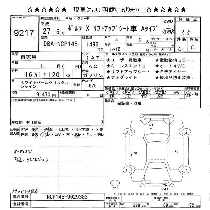 | X | DBA-NCP145 | 1NZ-FE | Full-time 4WD | CVT | 1496cc | 103ps(76kW)/6000rpm | AИ-92 | 1 867 418 | |
