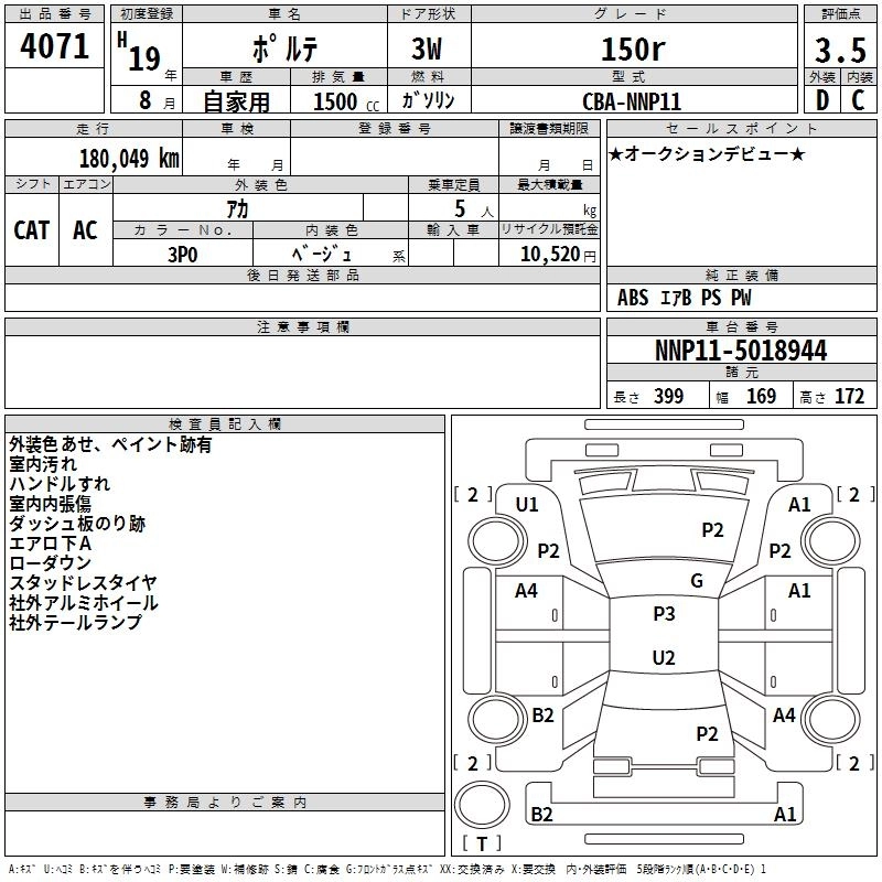 | 150R | CBA-NNP11 | 1NZ-FE | FF | 4AT | 1496cc | 109ps(80kW)/6000rpm | AИ-92 | 1 596 000 | |