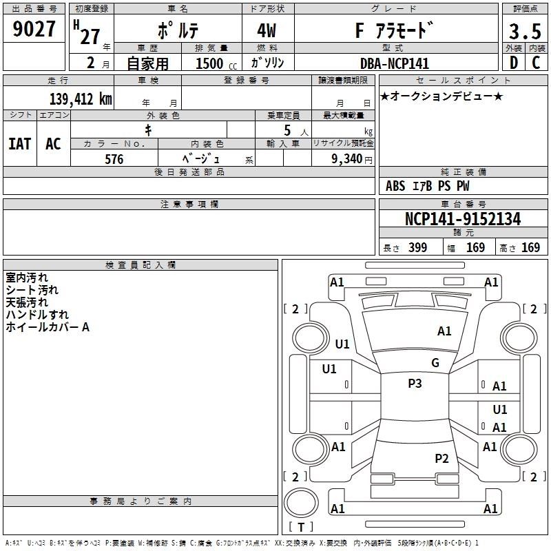 | F | DBA-NCP145 | 1NZ-FE | Full-time 4WD | CVT | 1496cc | 103ps(76kW)/6000rpm | AИ-92 | 1 909 637 | |