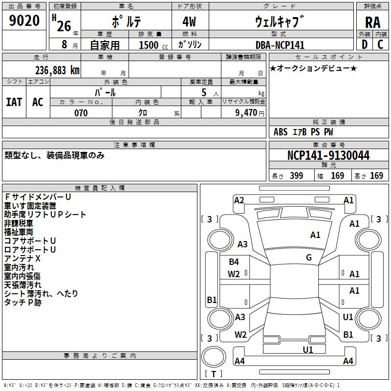| F | DBA-NCP145 | 1NZ-FE | Full-time 4WD | CVT | 1496cc | 103ps(76kW)/6000rpm | AИ-92 | 1 861 715 | |