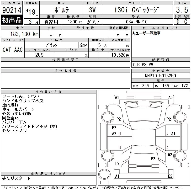 | 130I C PACKAGE | CBA-NNP10 | 2NZ-FE | FF | 4AT | 1298cc | 87ps(64kW)/6000rpm | AИ-92 | 1 512 000 | |