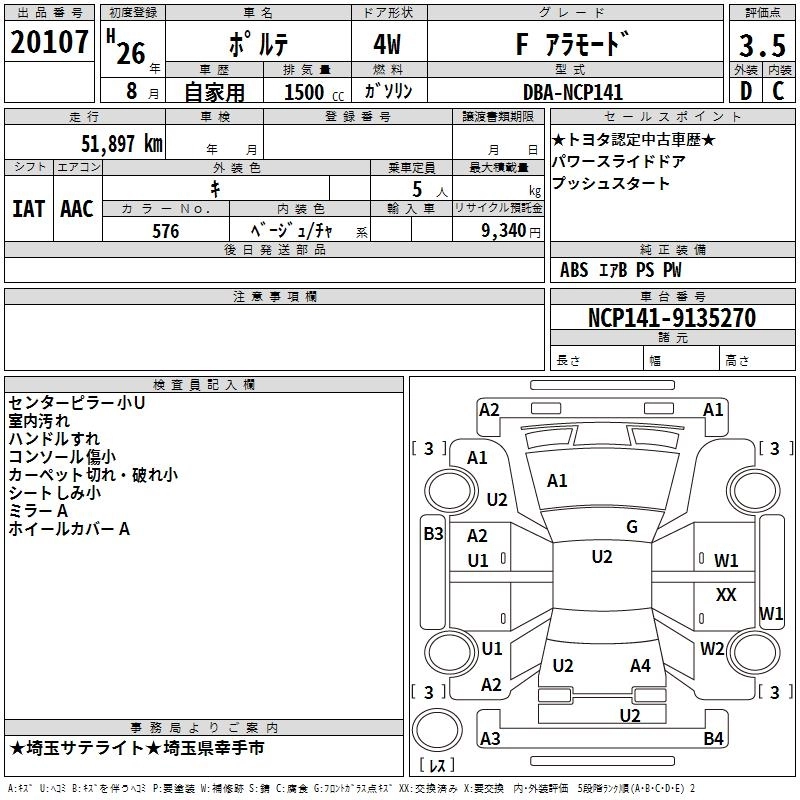 | F | DBA-NCP145 | 1NZ-FE | Full-time 4WD | CVT | 1496cc | 103ps(76kW)/6000rpm | AИ-92 | 1 861 715 | |