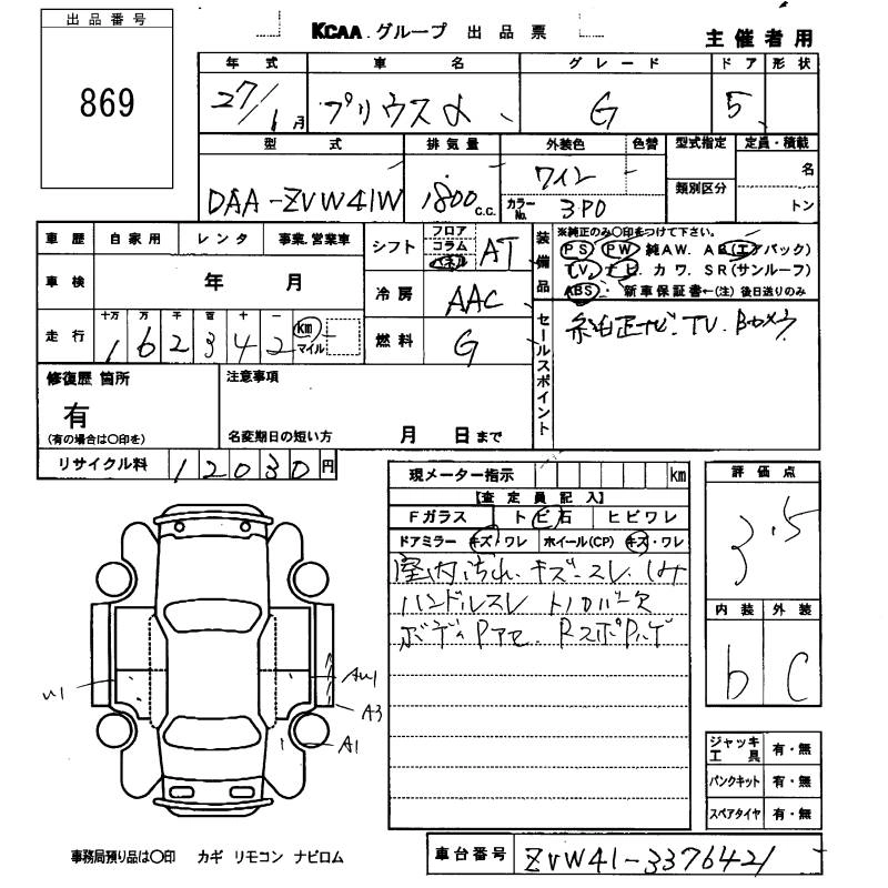 TOYOTA PRIUS ALPHA 2015 г., лот № 869