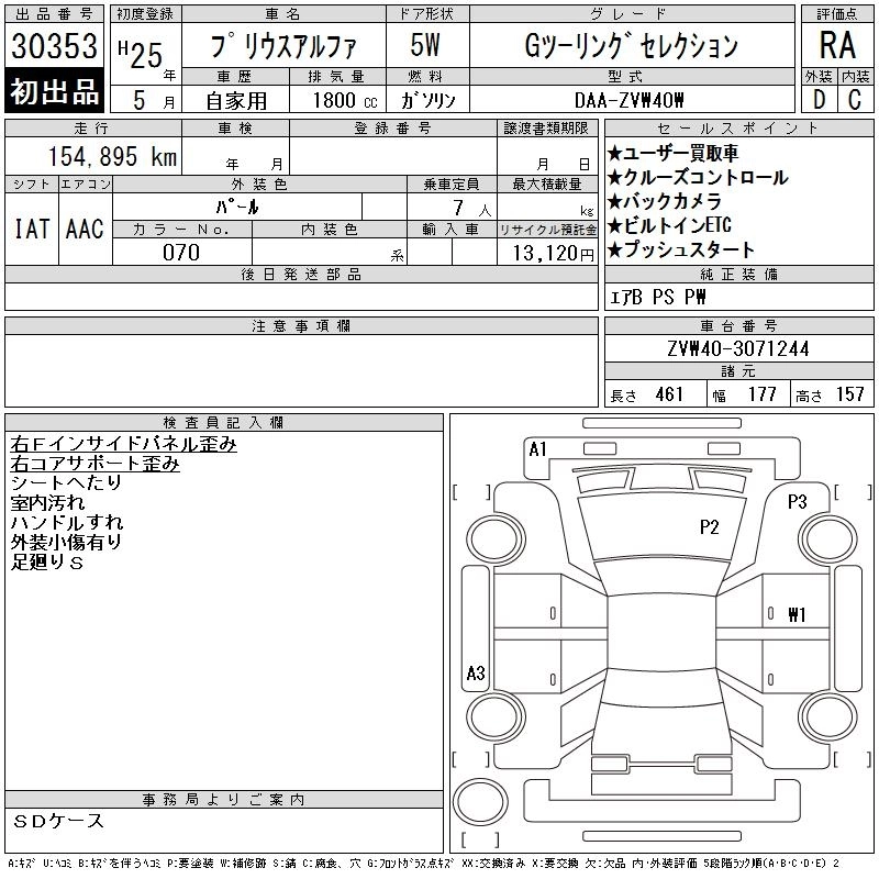 Год выпуска2013 Пробег 155 000 км КузовZVW40W КомплектацияG TOURING SELECTION