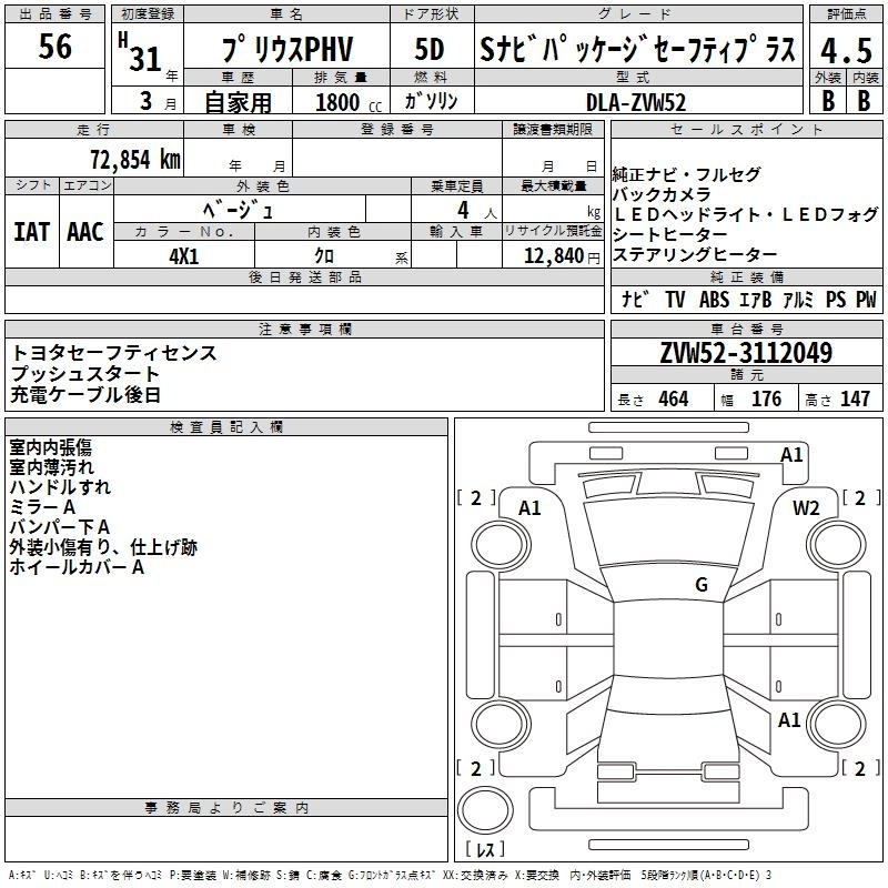 A PREMIUM NAVI PACKAGE DLA-ZVW52 2ZR-FXE FF CVT 1797cc 98ps(72kW)/5200rpm AИ-92 4 345 000