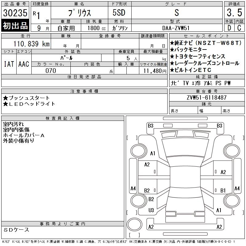 | A PREMIUM | DAA-ZVW51 | 2ZR-FXE | FF | CVT | 1797cc | 98ps(72kW)/5200rpm | AИ-92 | 3 234 000 | |