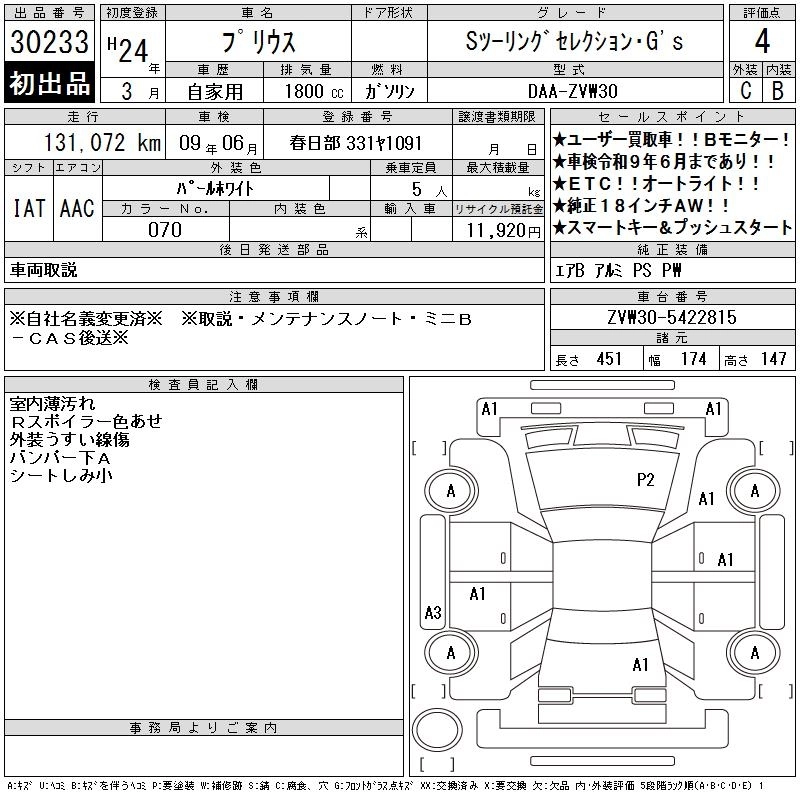 | G TOURING SELECTION LEATHER PACKAGE | DAA-ZVW30 | 2ZR-FXE | FF | CVT | 1797cc | 99ps(73kW)/5200rpm | AИ-92 | 3 340 000 | |