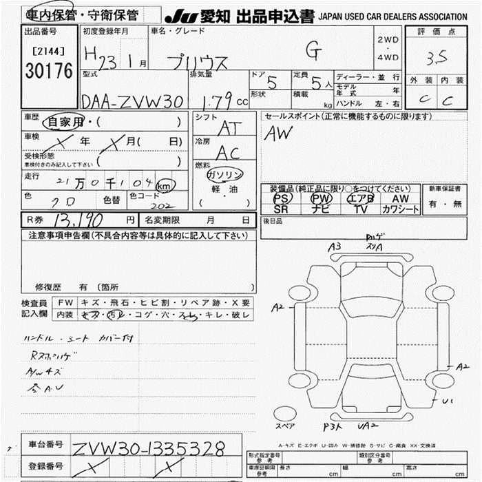 | G | DAA-ZVW30 | 2ZR-FXE | FF | CVT | 1797cc | 99ps(73kW)/5200rpm | AИ-92 | 2 520 000 | |